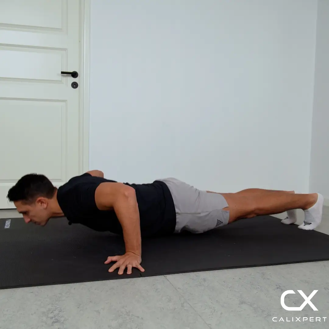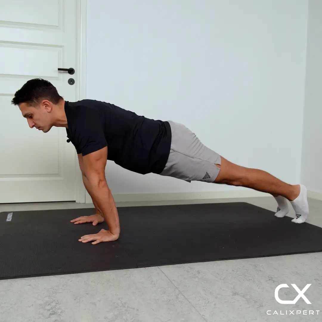 - Press through your hands to lift your hips off the ground, keeping your legs straight and together. Your body should form an L-shape, with your torso upright and legs parallel to the floor.