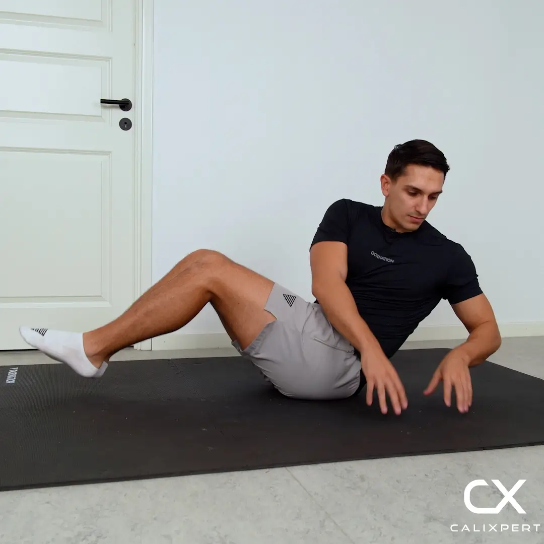 - Sit on the floor with your legs extended in front of you. Place your hands on the ground beside your hips, fingers pointing forward. Engage your core and lift your body slightly off the ground.
